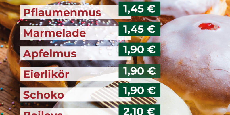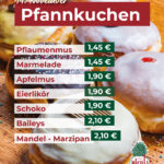 Bei uns gibt’s die leckersten Pfannkuchen mit vielen verschiedenen Füllungen, ob klassisch mit Pflaumenmus oder Marmelade, fruchtig mit Apfelmus, cremig mit Eierlikör, schokoladig, verführerisch mit Baileys oder besonders fein mit Mandel-Marzipan. Schon ab 1,45 € genießt frisch gebackenes und erlebt einen Tag voller Genuss.